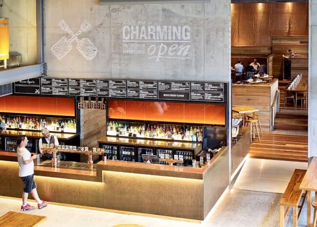 The Charming Squire fit-out from 2014 was one of our earlier projects for Mantle Group Hospitality and was designed by Collins and Turner in collaboration with Barber Studio and D’Occhio. This James Squire label in South Bank features a number of incredibly unique spaces, including two completely custom copper bars, a micro-brewery on display in the center of the restaurant, mezzanine function spaces, as well as a pop out kitchen, encroaching the public space to connect inside from outside and to engage passing pedestrians to view the chefs hard at work. The kitchens and bars were fit-out with completely bespoke stainless steel and custom copper features, as well as integrating commercial foodservice equipment brands from the likes of Moffat, Williams Refrigeration, FSM, Mantova and more.